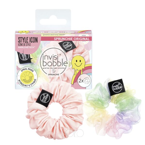 Набір з 2-х ультраеластичних, м'яких і загорнутих в тканину резинок для волосся. З їх допомогою можна зробити ідеальний хвіст, або ви можете носити ці стильні аксесуари на зап'ясті в якості браслета. Резинка invisibobble SPRUNCHIE надійно фіксує волосся, не пошкоджуючи його і не залишаючи заломів. Забезпечує високий комфорт при носінні і не провокує головні болі. Підходить для всіх типів волосся. Всередині аксесуара знаходиться резинка моделі ORIGINAL. Виконані в ретро-дизайні, кольори: веселка, рожевий.
