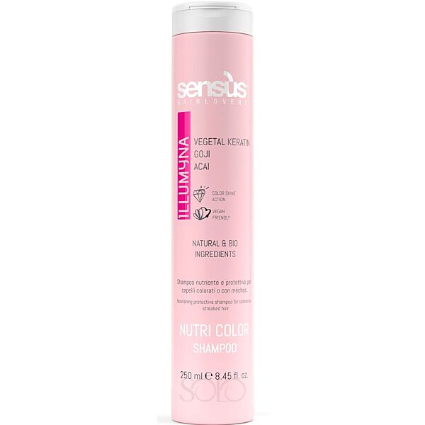 Італійський шампунь Sensus розроблений для щоденного догляду за фарбованим волоссям. Він ефективно захищає фарбоване волосся. М'яко очищає, зволожує, додає блиску та подовжує стійкість кольору. Збагачений рослинним кератином, ягодами годжі та асаї.