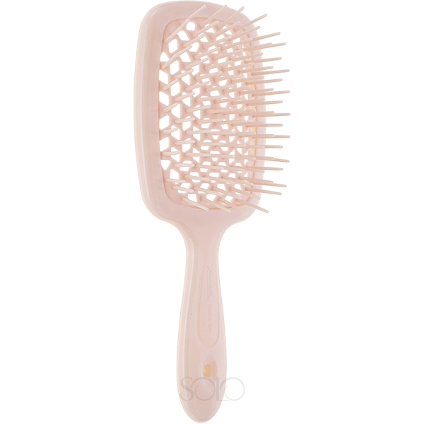 Щітка Janeke Superbrush - це універсальний аксесуар для щоденного догляду за волоссям. Вона дбайливо розплутує пасма, підходить для сушіння феном і рівномірного розподілу засобів по догляду. Завдяки унікальній запатентованій конструкції з отворами у вигляді бджолиних стільників, гаряче повітря циркулює рівномірно, прискорюючи сушіння без перегріву і шкоди для волосся. Щітка запобігає ламкості та посіченню кінчиків, зберігаючи структуру і здоров'я волосся. Аксесуар поєднує в собі стильний пудровий відтінок і зручний розмір 20×8 см, завдяки чому вона не тільки практична, але й естетична. Продумана продувна конструкція зменшує тепловий вплив і статичну електрику. Виготовлена з міцного, термостійкого пластику, щітка оснащена гнучкими, закругленими зубчиками, які м'яко масажують шкіру голови, покращують кровообіг і сприяють зміцненню коренів. Superbrush також підходить для нанесення масок, масел та інших засобів по догляду. Догляд за щіткою не вимагає зусиль - вона легко миється і зберігає свої функціональні якості. Підходить для розчісування як сухого, так і вологого волосся, не пошкоджує ні шкіру голови, ні структуру пасом. Відмінно підійде як дорослим, так і дітям. Щітка універсальна - підходить для всіх типів волосся: тонкого, густого, прямого, кучерявого, натурального, нарощеного, неслухняного, дитячого і навіть для перук. Ергономічна ручка зручно лежить в руці і не вислизає. Щітку можна брати з собою в дорогу, помістивши її в сумочку або косметичку. Janeke Superbrush - відмінний вибір для тих, хто цінує якість, і прагне до бездоганного догляду кожен день.