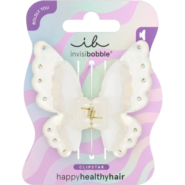 Заколка для волосся від бренду Invisibobble CLIPSTAR Fairy Fierce - це стильний і грайливий аксесуар з колекції BOLDLY YOU, створений для ефектних зачісок. Дизайн аксесуара у формі метелика з перламутровим сяйвом і витонченими стразами поєднує в собі ніжну жіночність і сміливий характер. Декоративні стрази надають аксесуару казкового шарму і роблять його яскравим акцентом будь-якого образу. Ідеальний вибір для тих, хто прагне виглядати ніжно і впевнено, додаючи образу казковий настрій. Завдяки технології happyhealthyhair заколка дбайливо ставиться до волосся: не тягне і не пошкоджує його, не залишає заломів, не подразнює шкіру голови та забезпечує комфорт навіть при тривалому носінні. Аксесуар надійно фіксує волосся і підходить для всіх типів волосся. CLIPSTAR Fairy Fierce - це ідеальний вибір для тих, хто цінує казкову естетику, комфорт і турботу про здоров'я волосся.