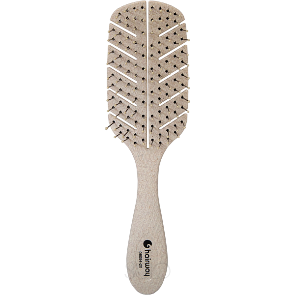 Массажная щётка от бренда Hairway Eco Corn предназначена для ухода за всеми типами волос. Она выполнена из экологичного биопластика без добавления смягчителей и полностью пригодна для вторичной переработки. Производство изделия отличается низким уровнем выбросов CO₂. Материал изделия состоит из 30% соломы (волокон пшеничных стеблей) и 70% полипропилена (PP). Щётка имеет мягкий кремовый цвет, 10 рядов и размеры 20,2×5,5 см. Лёгкая и удобная ручка обеспечивает комфортное использование, делая щётку идеальной для путешествий. Щётка универсальна: она подходит для сухих и влажных волос, коротких и длинных, тонких и густых, прямых и вьющихся. Аккуратно распутывает влажные пряди, не спутывая их. Нейлоновые зубчики с закруглёнными кончиками мягко воздействуют на кожу головы, а длинные щетины деликатно массируют, улучшая кровообращение и стимулируя рост волос. Щётка обладает термостойкостью и подходит для укладки с использованием фена.