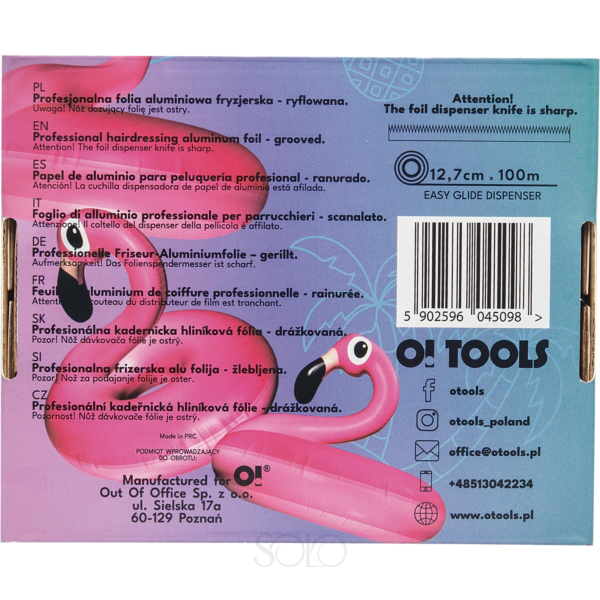 O! TOOLS PINK FLAMINGO - это профессиональная рифлёная алюминиевая фольга в рулоне, созданная специально для использования парикмахерами и колористами. Незаменимый инструмент при окрашивании и осветлении волос. Рифлёная поверхность фольги обеспечивает надёжное сцепление с волосами, предотвращая её соскальзывание и позволяя уверенно удерживать прядь во время окрашивания. Плотная структура выдерживает любые окрашивающие и осветляющие составы, сохраняя форму и предотвращая протекание. Фольга предотвращает чрезмерному набуханию осветляющего продукта, что влияет на точность и безопасность работы. Благодаря циркуляции воздуха между листами снижается риск чрезмерного повреждения волос. Фольга обладает прочным сцеплением, при этом легко снимается и не создаёт ощущения натяжения волос. В упаковке представлен рулон длиной 100 метров, что позволяет самостоятельно регулировать необходимую длину фольги и обеспечивает длительное, удобное использование. Рулон упакован в практичной коробке-диспенсере с дозатором: достаточно удалить защитную ленту, чтобы отмерить нужный отрезок. Формат 100 метров идеально подходит для интенсивной работы и большого потока клиентов. Яркий дизайн PINK FLAMINGO (Розовый фламинго) привлекает внимание и придаёт рабочему процессу эстетичный и элегантный вид. Фольга стильно смотрится во время процедуры и подойдёт профессиональным колористам, которые ценят высокое качество, удобство и современный дизайн профессиональных инструментов.