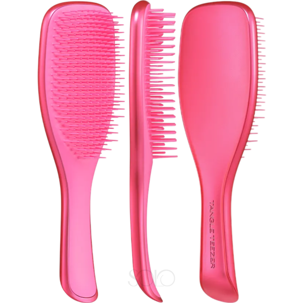 Щетка для волос Tangle Teezer The Ultimate Detangler Chrome Afterparty Pink - это стильный премиальный аксессуар из хромированной коллекции универсальных щеток с ручкой, созданный для ежедневного ухода. Она выполнена в эффектном оттенке розовое афтерпати с ярким и элегантным дизайном. Благодаря запатентованной технологии щетинок с двухуровневыми гибкими зубчиками, щетка аккуратно распутывает влажные волосы, не повреждая их и не выдергивая, тем самым снижая риск ломкости. Длинные гибкие зубцы распутывают пряди, а короткие разглаживают их, обеспечивая комфортное и деликатное расчесывание. Щетка также бережно расчесывает сухие волосами, придавая им гладкость и блеск. Эргономичная ручка удобна и функциональна, обеспечивает максимальный комфорт при расчесывании, она легко скользит по волосам и не выскальзывает из мокрых рук, что делает ее идеальной для применения в душе. Аксессуар подходит для всех типов волос, мягко массирует кожу головы и помогает равномерно распределять уходовые средства по длине волос. Не рекомендуется использовать щетку вместе с феном. Чтобы продлить срок службы щетки Tangle Teezer, после каждого использования удаляйте с нее волосы. Периодически мойте щетку тёплой водой с мягким мылом или шампунем. После мытья дайте щетке высохнуть естественным образом щетиной вниз или на боку, и не размещайте на ней тяжёлые предметы. Выбирая щетку в хромированном оттенке розовое афтерпати, вы превращаете ежедневный уход за волосами в более комфортную и приятную процедуру, придавая им здоровый и ухоженный вид.